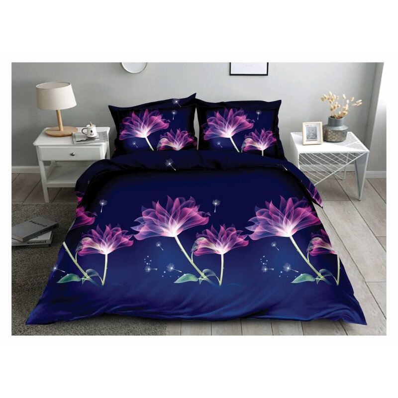Двойно спално бельо, 3D принт лилави цветя, 4 части, 2 лица, 220x240 см